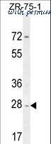NDUFAF1 Antibody western blot of ZR-75-1 cell line lysates (35 ug/lane). The NDUFAF1 antibody detected the NDUFAF1 protein (arrow).