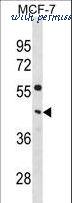 PCYT1A Antibody western blot of MCF-7 cell line lysates (35 ug/lane). The PCYT1A antibody detected the PCYT1A protein (arrow).