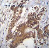 PCYT1A Antibody immunohistochemistry of formalin-fixed and paraffin-embedded human colon carcinoma followed by peroxidase-conjugated secondary antibody and DAB staining.