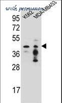PCYT1A Antibody western blot of K562,MDA-MB453 cell line lysates (35 ug/lane). The PCYT1A antibody detected the PCYT1A protein (arrow).