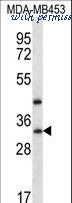 TAF9B Antibody western blot of MDA-MB453 cell line lysates (35 ug/lane). The TAF9B antibody detected the TAF9B protein (arrow).
