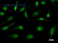 Immunostaining analysis in HeLa cells. HeLa cells were fixed with 4% paraformaldehyde and permeabilized with 0.1% Triton X-100 in PBS. The cells were immunostained with anti-TAF9L mAb.