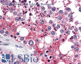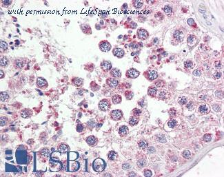 Anti-UIMC1 / RAP80 antibody IHC of human testis. Immunohistochemistry of formalin-fixed, paraffin-embedded tissue after heat-induced antigen retrieval. Antibody concentration 5 ug/ml.
