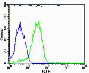 Flow cytometric of MCF-7 cells with UIMC1 Antibody (green) compared to an isotype control of rabbit IgG (blue). Antibody was diluted at 1:25 dilution. An Alexa Fluor 488 goat anti-rabbit lgG at 1:400 dilution was used as the secondary antibody.