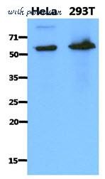 Western Blot: The cell lysates of HeLa (40 ug) and 293T (40 ug) were resolved by SDS-PAGE, transferred to PVDF membrane and probed with anti-human PDZK1 antibody (1:1000). Proteins were visualized using a goat anti-mouse secondary antibody conjugated to HRP and an ECL detection system.