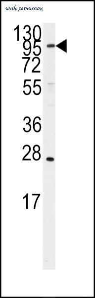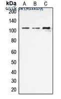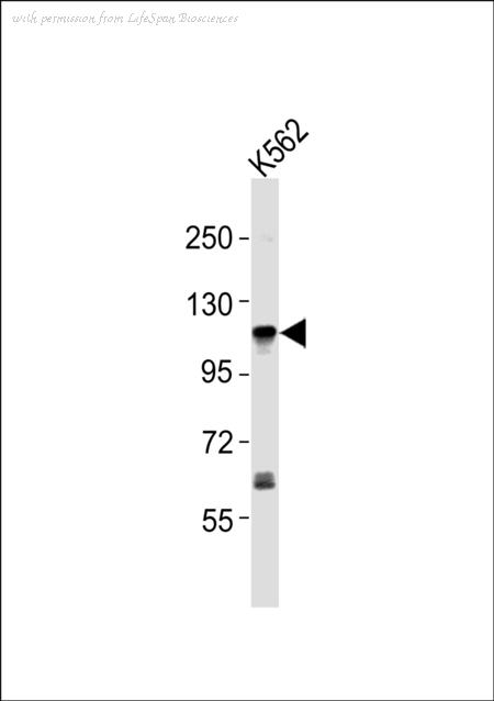 Anti-ERAP1 Antibody at 1:1000 dilution + K562 whole cell lysates Lysates/proteins at 20 ug per lane. Secondary Goat Anti-Rabbit IgG, (H+L),Peroxidase conjugated at 1/10000 dilution Predicted band size : 107 kDa Blocking/Dilution buffer: 5% NFDM/TBST.