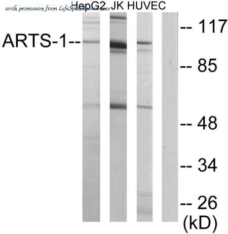 Western blot analysis of lysates from HepG2, Jurkat, and HUVEC cells, using ARTS-1 Antibody. The lane on the right is blocked with the synthesized peptide.