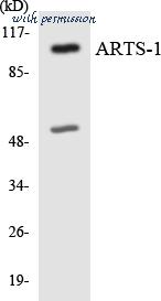 Western blot of anti-ARTS1 Antibody in Ramos cell line lysates (35 ug/lane). ARTS1 (arrow) was detected using the purified antibody.