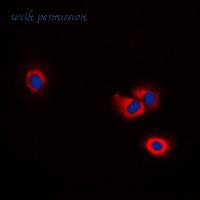 Immunofluorescent analysis of ERAP1 staining in NIH3T3 cells. Formalin-fixed cells were permeabilized with 0.1% Triton X-100 in TBS for 5-10 minutes and blocked with 3% BSA-PBS for 30 minutes at room temperature. Cells were probed with the primary antibody in 3% BSA-PBS and incubated overnight at 4 C in a humidified chamber. Cells were washed with PBST and incubated with a DyLight 594-conjugated secondary antibody (red) in PBS at room temperature in the dark. DAPI was used to stain the cell nuclei (blue).