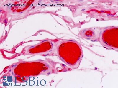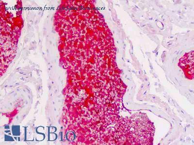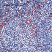 Formalin-fixed, paraffin-embedded human tonsil stained with peroxidase-conjugate and AEC chromogen. Note cytoplasmic staining of endothelial cells.