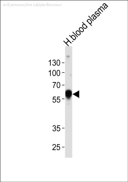 Western blot of lysate from human blood plasma tissue lysate, using SERPINA1 Antibody. Antibody was diluted at 1:1000 at each lane. A goat anti-rabbit IgG H&L (HRP) at 1:5000 dilution was used as the secondary antibody. Lysate at 35ug per lane.