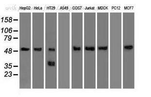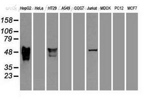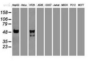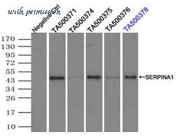 Western blot of extracts (35 ug) from 9 different cell lines by using anti-SERPINA1 monoclonal antibody.