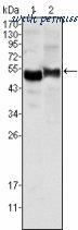 A1AT antibody (1C2) at 1:1000 dilution + lysates from HEK-293T transfected with human A1AT expression vector.