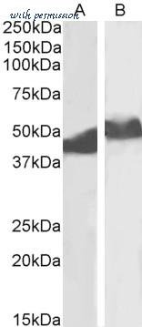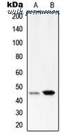 Western blot analysis of Serpin A1 expression in HepG2 (A); HeLa (B) whole cell lysates.