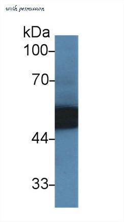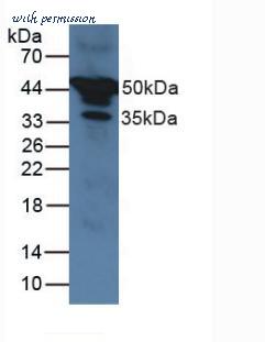 Western Blot; Sample: Mouse Heart lysate; Primary Ab: 2µg/ml Rabbit Anti-Mouse a1AT Antibody Second Ab: 0.2µg/mL HRP-Linked Caprine Anti-Rabbit IgG Polyclonal Antibody
