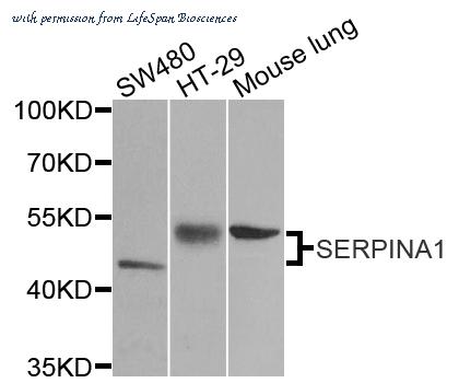 Western blot analysis of extracts of various cell lines, using SERPINA1 antibody at 1:1000 dilution. The secondary antibody used was an HRP Goat Anti-Rabbit IgG (H+L) at 1:10000 dilution. Lysates were loaded 25ug per lane and 3% nonfat dry milk in TBST was used for blocking.
