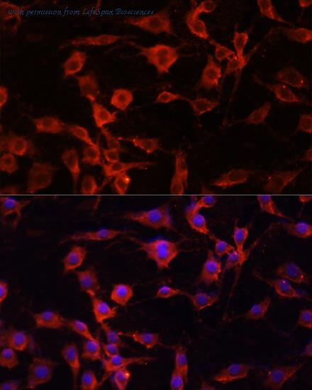 Immunofluorescence analysis of PC-12 cells using SERPINA1 antibodyat dilution of 1:100 (40x lens). Blue: DAPI for nuclear staining.