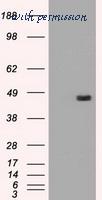 Immunoprecipitation(IP) of SERPINA1 by using TrueMab monoclonal anti-SERPINA1 antibodies (Negative control: IP without adding anti-SERPINA1 antibody.). For each experiment, 500ul of DDK tagged SERPINA1 overexpression lysates (at 1:5 dilution with HEK293T lysate), 2ug of anti-SERPINA1 antibody and 20ul (0.1mg) of goat anti-mouse conjugated magnetic beads were mixed and incubated overnight. After extensive wash to remove any non-specific binding, the immuno-precipitated products were analyzed with rabbit anti-DDK polyclonal antibody.