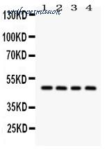 SERPINA1 antibody Western blot. All lanes: Anti SERPINA1 at 0.5 ug/ml. Lane 1: Rat Testis Tissue Lysate at 50 ug. Lane 2: Mouse Testis Tissue Lysate at 50 ug. Lane 3: Rat Liver Tissue Lysate at 50 ug. Lane 4: Mouse Liver Tissue Lysate at 50 ug. Predicted band size: 47 kD. Observed band size: 47 kD.