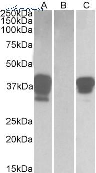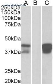 HEK293 lysate (10ug protein in RIPA buffer) overexpressing Human BOB1 with DYKDDDDK tag probed with (1ug/ml) in Lane A and probed with anti- DYKDDDDK Tag (1/3000) in lane C. Mock-transfected HEK293 probed (1mg/ml) in Lane B. Primary inc