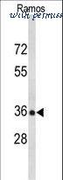 Western blot of POU2AF1 Antibody in Ramos cell line lysates (35 ug/lane). POU2AF1 (arrow) was detected using the purified antibody.