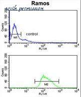 POU2AF1 Antibody flow cytometry of Ramos cells (bottom histogram) compared to a negative control cell (top histogram). FITC-conjugated goat-anti-rabbit secondary antibodies were used for the analysis.