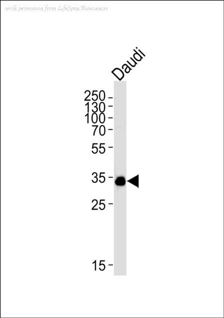 POU2AF1 Antibody western blot of Daudi cell line lysates (35 ug/lane). The POU2AF1 antibody detected the POU2AF1 protein (arrow).