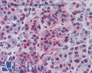 Anti-NDE1 antibody IHC of human pancreas. Immunohistochemistry of formalin-fixed, paraffin-embedded tissue after heat-induced antigen retrieval. Antibody concentration 5 ug/ml. This image was taken for the unconjugated form of this product. Other forms have not been tested.