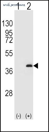 Western blot of PPP1CB (arrow) using rabbit polyclonal PPP1CB Antibody (K301). 293 cell lysates (2 ug/lane) either nontransfected (Lane 1) or transiently transfected (Lane 2) with the PPP1CB gene.