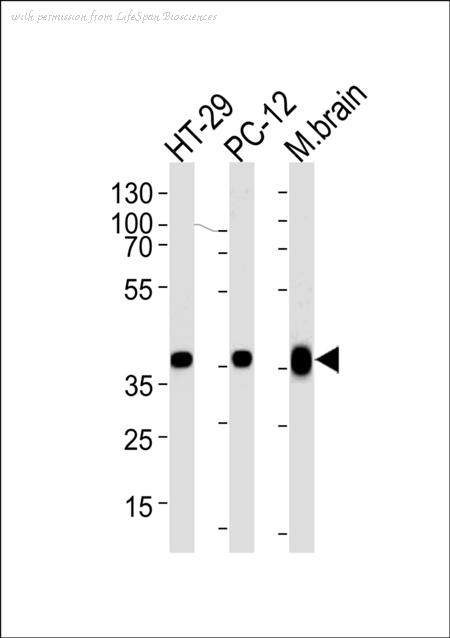 Western blot of lysates from HT-29, PC-12 cell line and mouse brain tissue lysate (from left to right), using PPP1CB Antibody. Antibody was diluted at 1:1000 at each lane. A goat anti-rabbit IgG H&L (HRP) at 1:5000 dilution was used as the secondary antibody. Lysate at 35ug per lane.