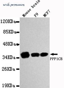 Western blot detection of PPP1CB in Mouse brain,F9&MCF7 cell lysates using PPP1CB antibody (1:1000 diluted).