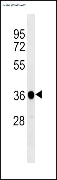 XENLA ppp1cb Antibody western blot of U251 cell line lysates (35 ug/lane). The XENLA ppp1cb antibody detected the XENLA ppp1cb protein (arrow).