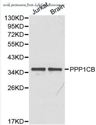 Western blot of PPP1CB pAb in extracts from Jurkat cells and mouse brain tissue.