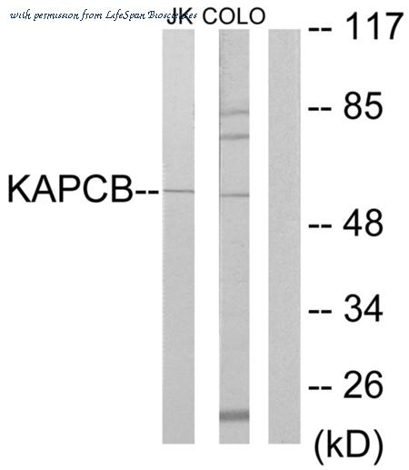 Western blot analysis of lysates from Jurkat and COLO205 cells, using KAPCB Antibody. The lane on the right is blocked with the synthesized peptide.