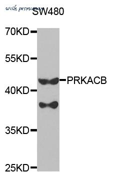 Western blot analysis of extracts of SW480 cell line, using PRKACB antibody.