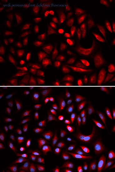 Immunofluorescence analysis of U2OS cell using PRKACB antibody. Blue: DAPI for nuclear staining.