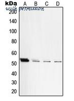 Western blot analysis of PKA C beta expression in HEK293T (A); NIH3T3 (B); mouse lung (C); rat lung (D) whole cell lysates.