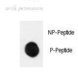 Dot blot of anti-Phospho-MEK1-pS222 Antibody on nitrocellulose membrane. 50ng of Phospho-peptide or Non Phospho-peptide per dot were adsorbed. Antibody working concentrations are 0.5ug per ml.