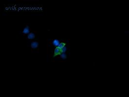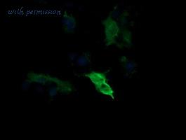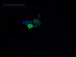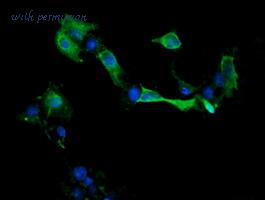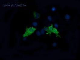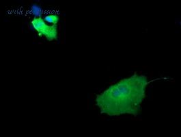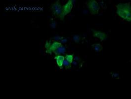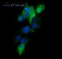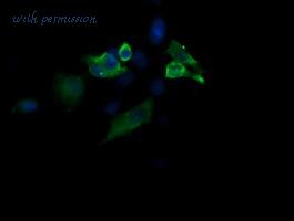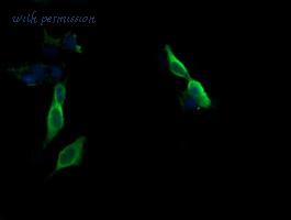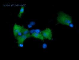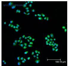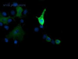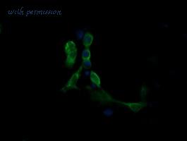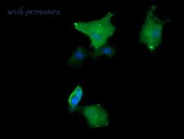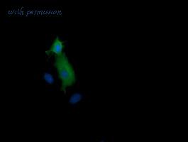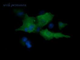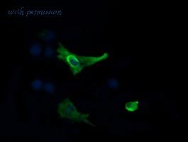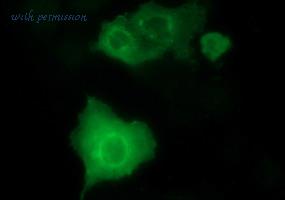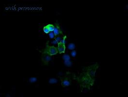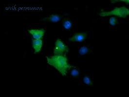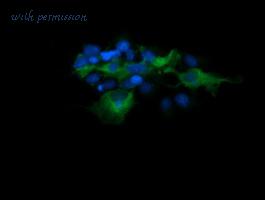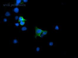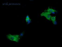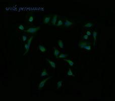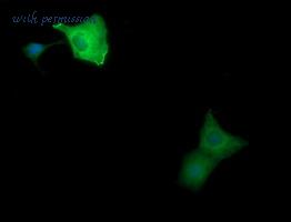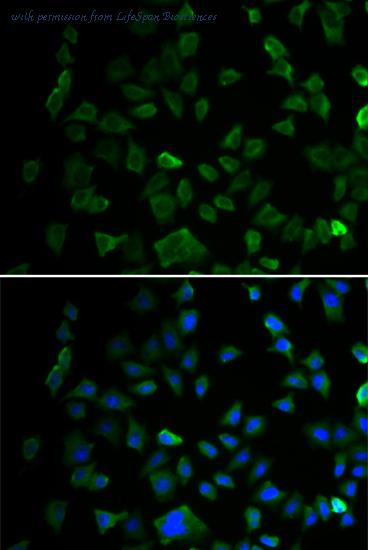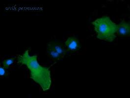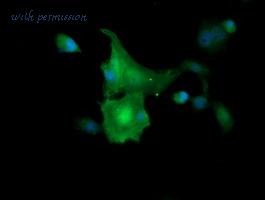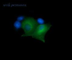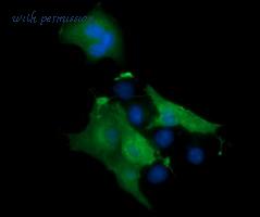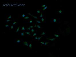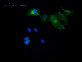 Confocal immunofluorescent staining of HeLa cells using MAP2K1 / MKK1 / MEK1 Antibody (green); nuclei are stained in blue pseudocolor using DRAQ5.