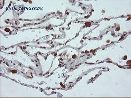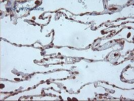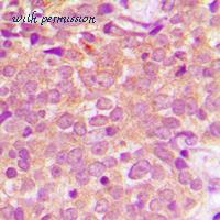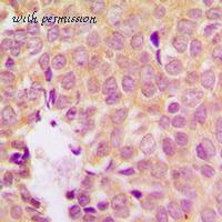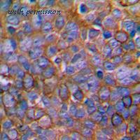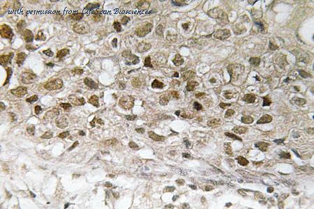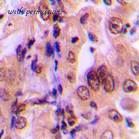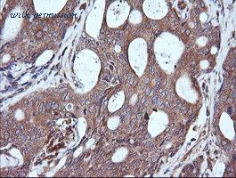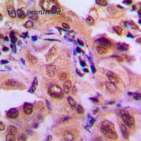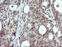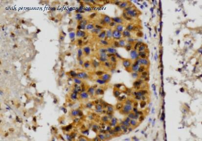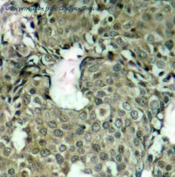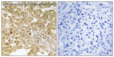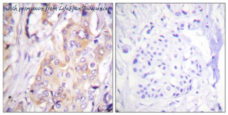 Immunohistochemistry analysis of paraffin-embedded human breast carcinoma tissue, using MEK1 Antibody. The picture on the right is blocked with the synthesized peptide.