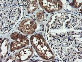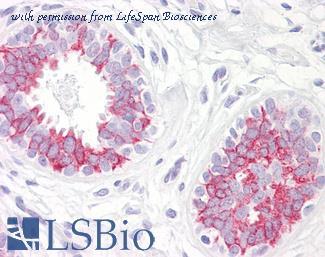 Immunohistochemical analysis of MKK1 staining in human prostate cancer formalin fixed paraffin embedded tissue section. The section was pre-treated using heat mediated antigen retrieval with sodium citrate buffer (pH 6.0). The section was then incubated with the antibody at room temperature and detected using an HRP conjugated compact polymer system. DAB was used as the chromogen. The section was then counterstained with hematoxylin and mounted with DPX.