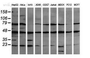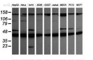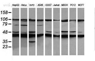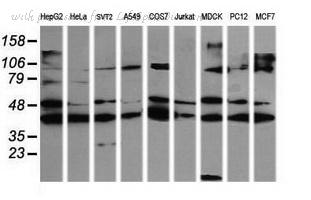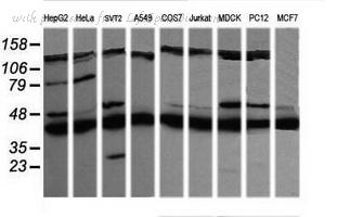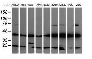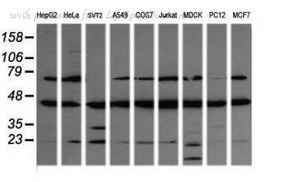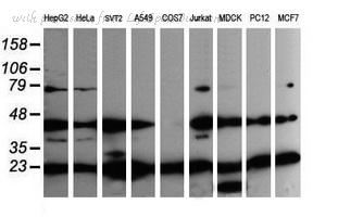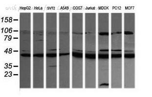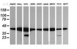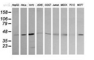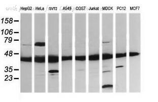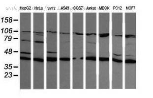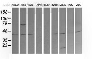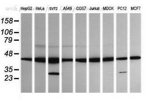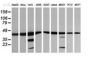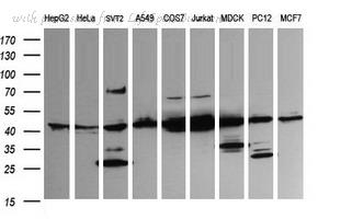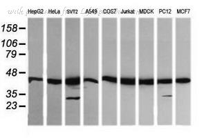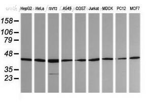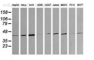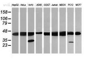 Western blot of extracts (35ug) from 9 different cell lines by using anti-MAP2K1 monoclonal antibody (HepG2: human; HeLa: human; SVT2: mouse; A549: human; COS7: monkey; Jurkat: human; MDCK: canine; PC12: rat; MCF7: human).
