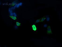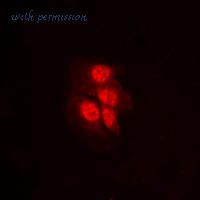 Immunofluorescent analysis of MKK1 (pT292) staining in HeLa cells. Formalin-fixed cells were permeabilized with 0.1% Triton X-100 in TBS for 5-10 minutes and blocked with 3% BSA-PBS for 30 minutes at room temperature. Cells were probed with the primary antibody in 3% BSA-PBS and incubated overnight at 4 C in a humidified chamber. Cells were washed with PBST and incubated with a DyLight 594-conjugated secondary antibody (red) in PBS at room temperature in the dark. DAPI was used to stain the cell nuclei (blue).