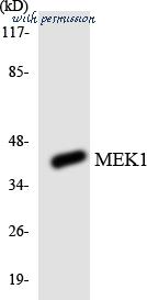 Western blot analysis of lysates from K562 cells, treated with, using MEK1 Antibody. The lane on the right is blocked with the synthesized peptide.