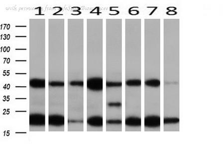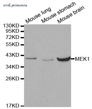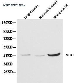 Western blot of extracts (10ug) from 8 Human tissue by using anti-MAP2K1 monoclonal antibody at 1:200 (1: Testis; 2: Uterus; 3: Breast; 4: Brain; 5: Liver; 6: Ovary; 7: Thyroid gland; 8: Colon).