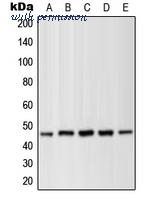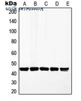 Western blot analysis of MKK1 expression in HeLa (A); A549 (B); MCF7 (C); HepG2 (D); PC12 (E) whole cell lysates.