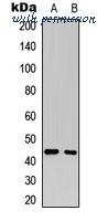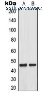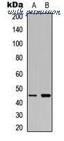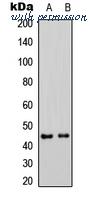 Western blot analysis of MKK1 expression in HepG2 (A); NIH3T3 (B) whole cell lysates.