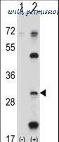 Western blot of PSMB5 (arrow) using rabbit polyclonal PSMB5 Antibody. 293 cell lysates (2 ug/lane) either nontransfected (Lane 1) or transiently transfected (Lane 2) with the PSMB5 gene.