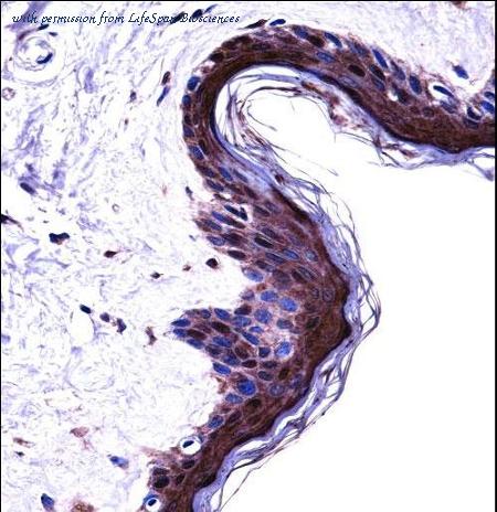 PSMB5 Antibody immunohistochemistry of formalin-fixed and paraffin-embedded human skin tissue followed by peroxidase-conjugated secondary antibody and DAB staining.
