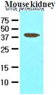 The extracts of mouse kidney (50 ug) were resolved by SDS-PAGE, transferred to NC membrane and probed with anti-human PDCD12 (1:1000). Proteins were visualized using a goat anti-mouse secondary antibody conjugated to HRP and an ECL detection system.